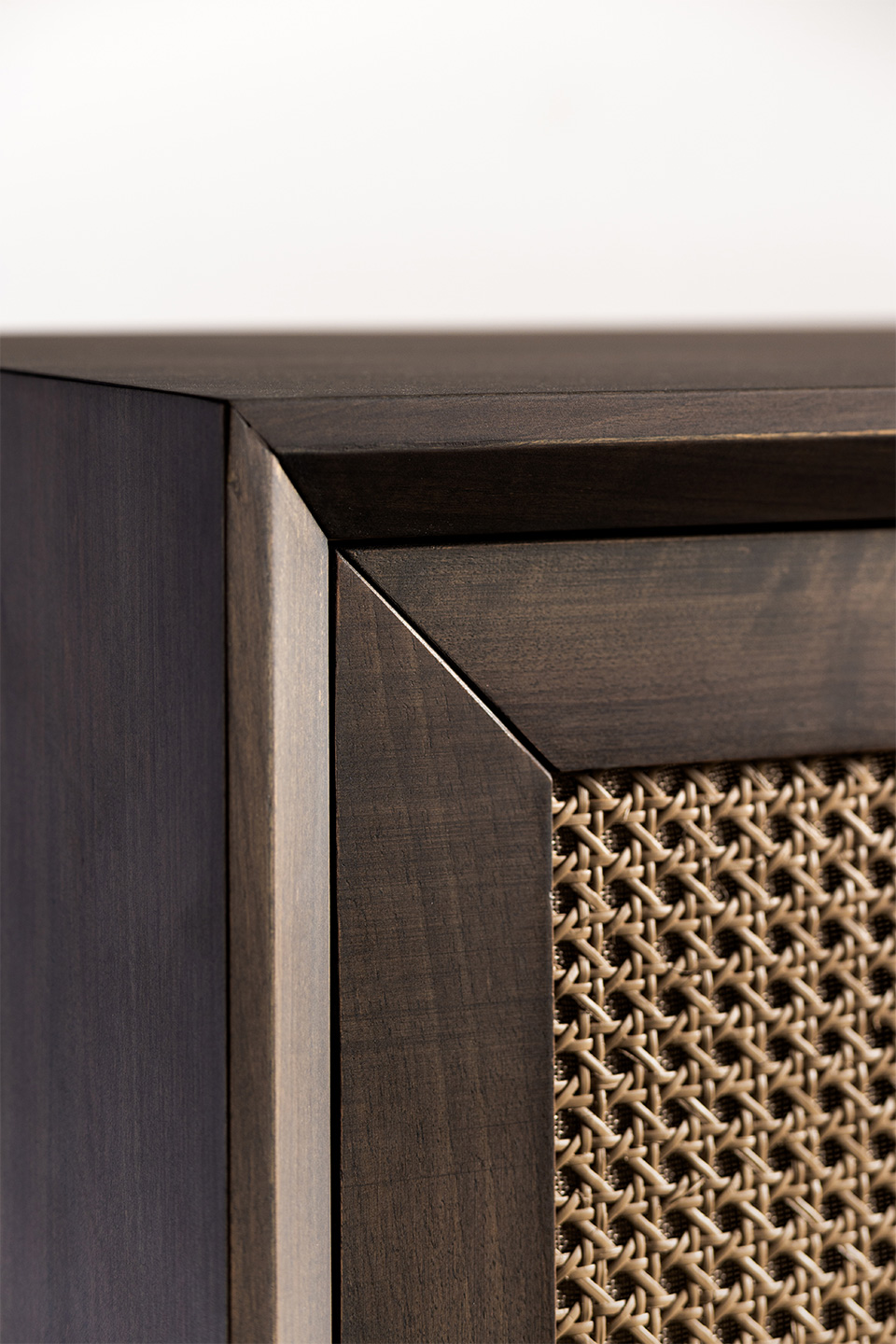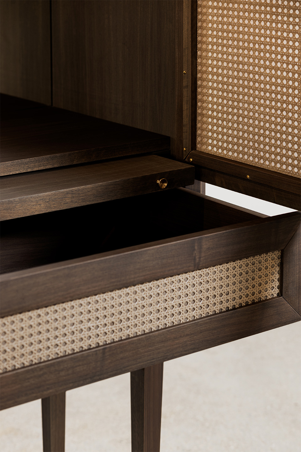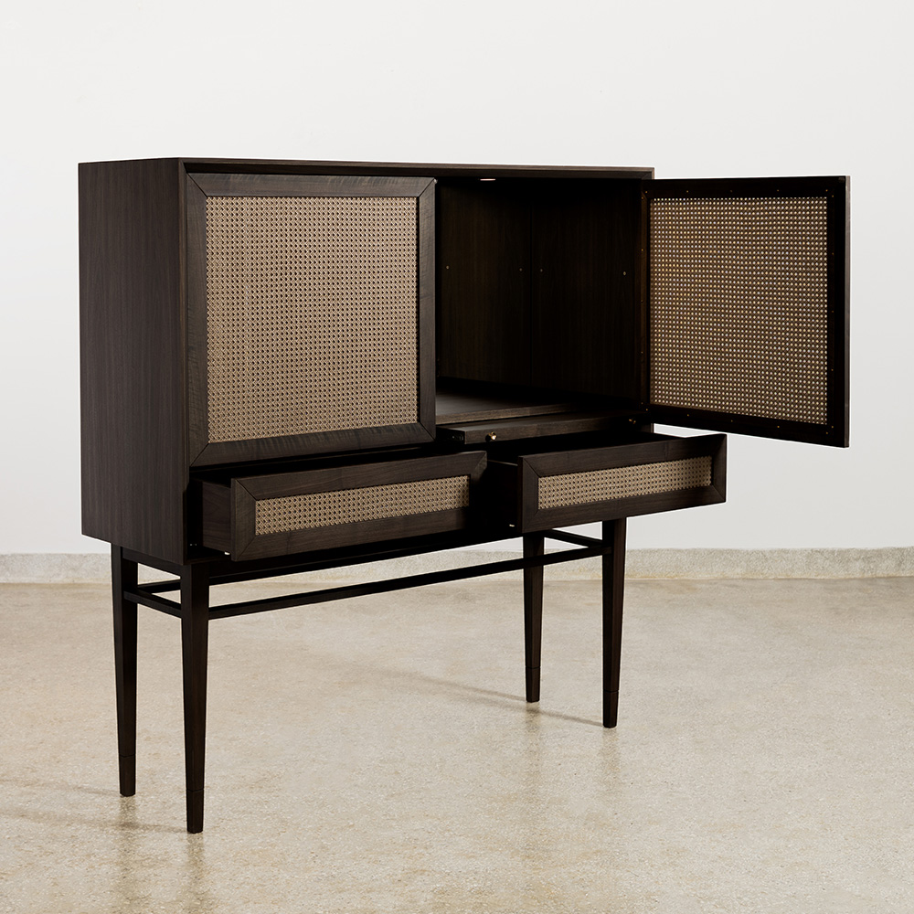 The Mid Century Modern Bar designed by Karageorgiou plays with contrast of material between dark colored oak and light tinted cane. Elegant and contemporary, with discreet push/pull mechanism and no handles, it is a functional piece with wide storage space.