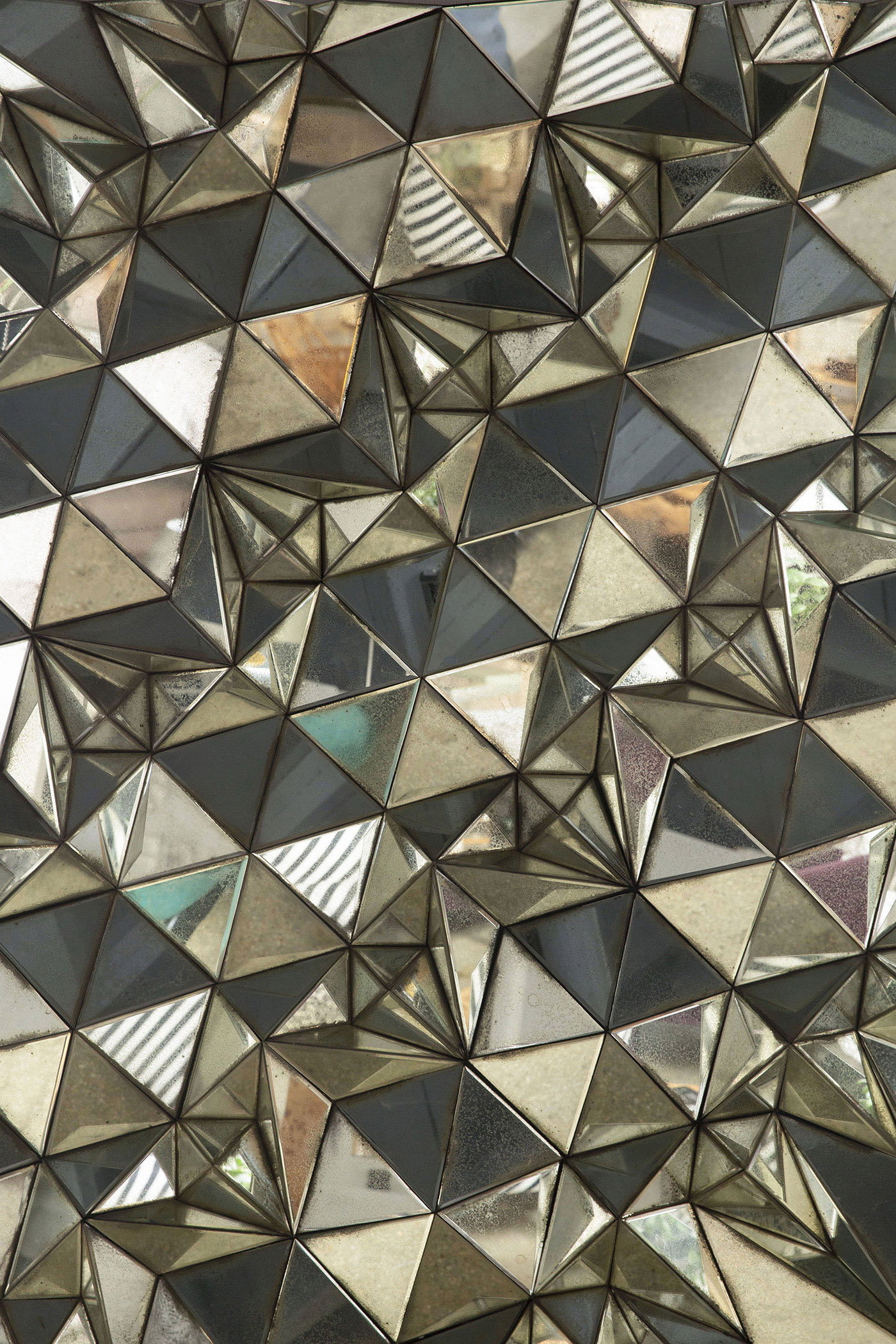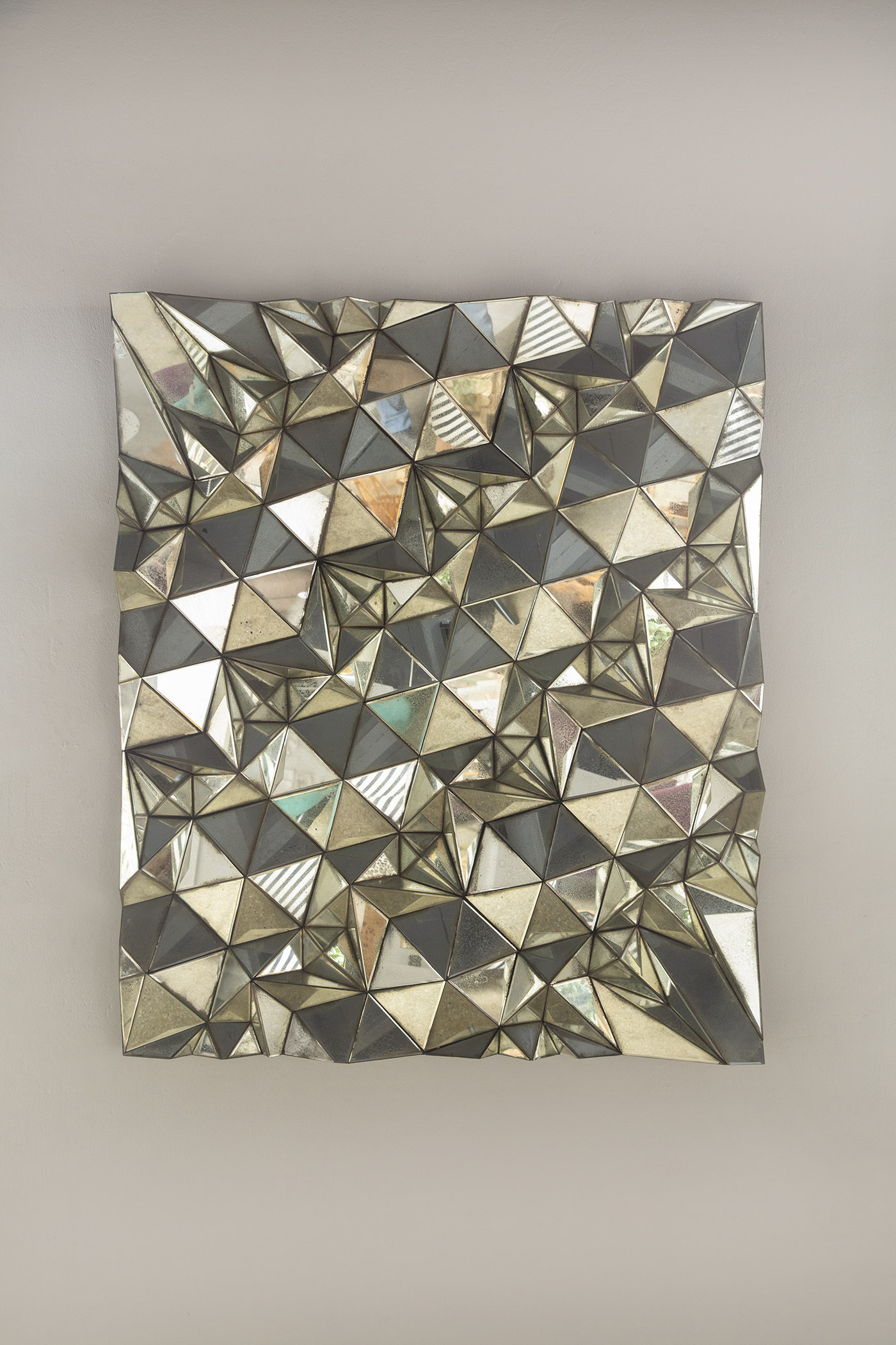 A striking wall decorative piece in antique mirror. The pyramid shaped frame design creates the illusion of depth and a more interesting visual, suitable for various decoration styles.