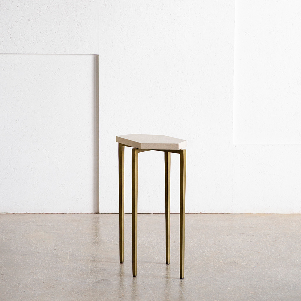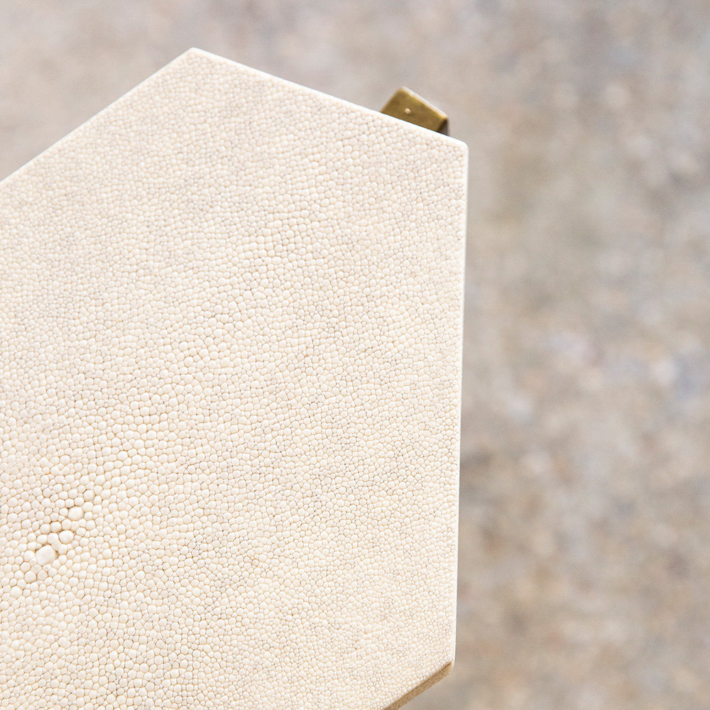 From the mythic collection of Ginger&Brown small hexagon side table with antique shagreen top, is the ideal accent piece that suits your space.