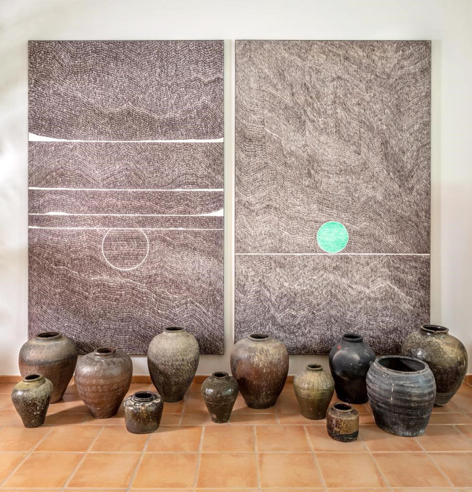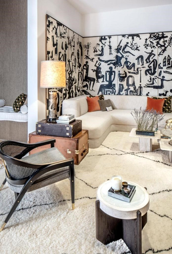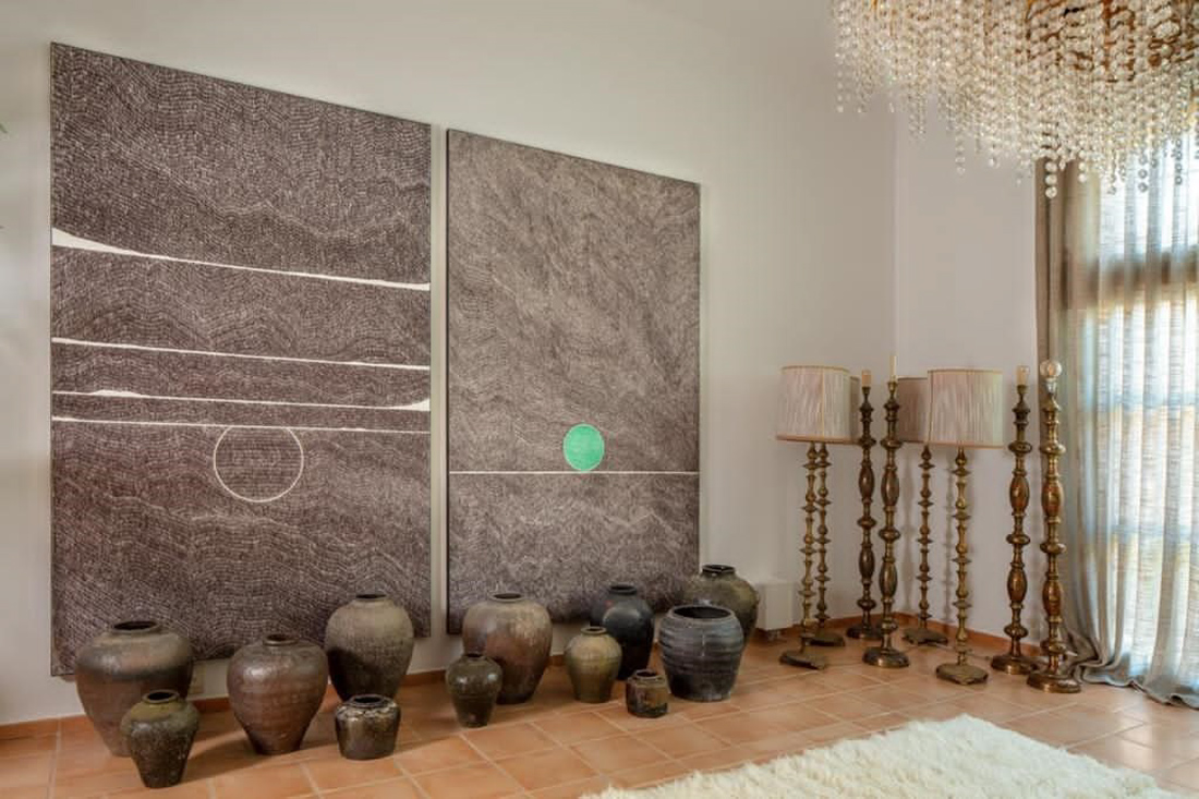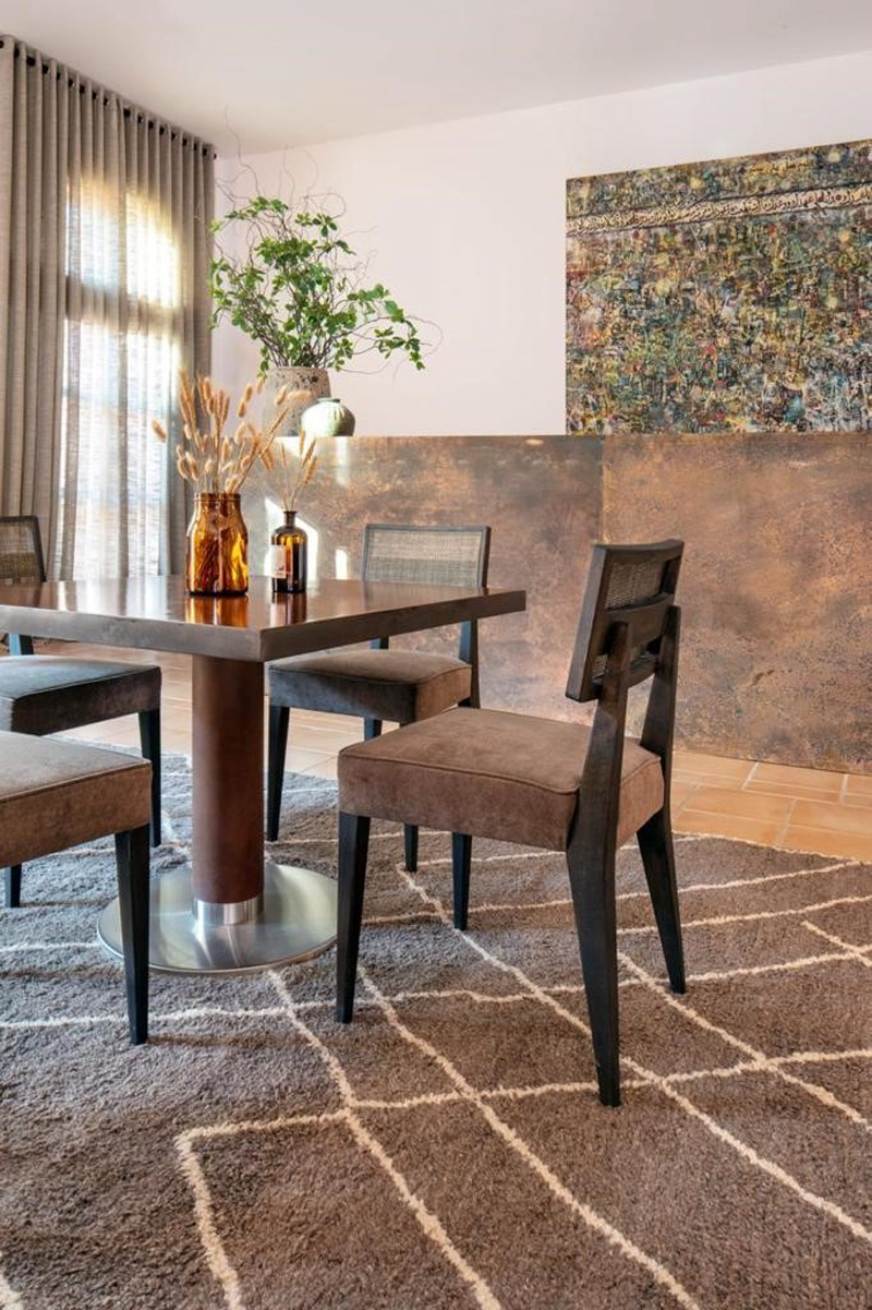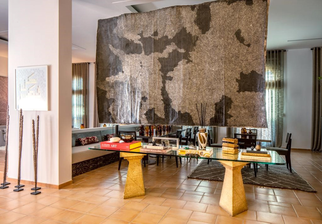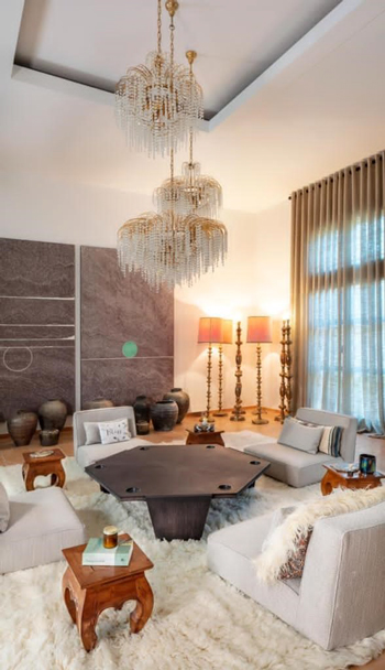 The Riyadh apartment of interior designer AKM embodies her eclectic style, mixing vintage and modern pieces with nature-inspired hues and statement art. Karageorgiou Interiors was commissioned to design custom furniture inspired by vintage designs. The dining table was reclaimed from the designers childhood playroom and KI custom-made dining chairs with cane and leather to complement it. Bespoke seating of a curved corner sofa was conceived around a super impressive oil-on-wood painting of figures from an Egyptian artist. Low-level seating and a central hexagonal table were custom made for the casual living area to be coordinated perfectly with a trio of crystal vintage chandeliers and artworks in ballpoint pen by Alexandros Tzannis. As featured at the cover of AD Middle East design publication.